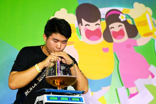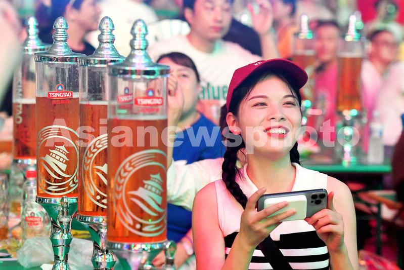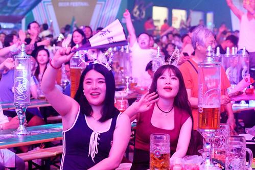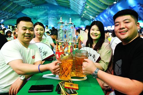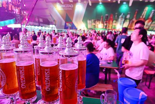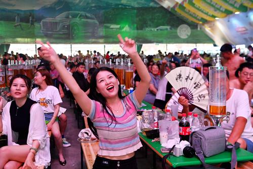 2023年7月16日,山东青岛金沙滩啤酒城,游客在啤酒大棚内饮酒狂欢。