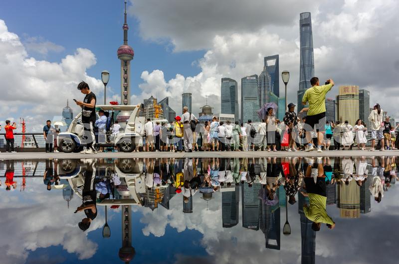 2023年7月17日,上海外滩附近游客众多,陆家嘴的摩天大楼在一片水面中映出清晰的倒影,蓝天白云与地标建筑和游客一起形成了“天空之境”美景,让人惊叹。