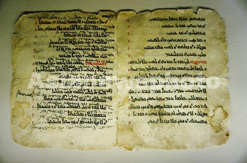 2023年7月18日,在中国丝绸博物馆拍摄到的敦煌莫高窟北区53窟出土的中国元代时期的叙利亚文《圣经》。