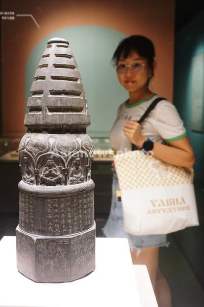 2023年7月18日,观众在中国丝绸博物馆观看中国南北朝北凉时期的高善穆石塔。