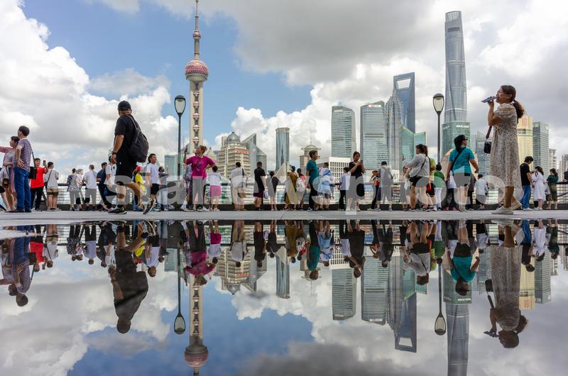 2023年7月17日,上海外滩附近游客众多,陆家嘴的摩天大楼在一片水面中映出清晰的倒影,蓝天白云与地标建筑和游客一起形成了“天空之境”美景,让人惊叹。