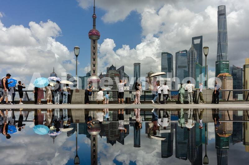 2023年7月17日,上海外滩附近游客众多,陆家嘴的摩天大楼在一片水面中映出清晰的倒影,蓝天白云与地标建筑和游客一起形成了“天空之境”美景,让人惊叹。