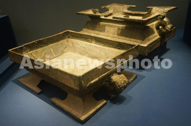 2023年7月20日,在中原夏商周礼乐文明展上拍摄到的春秋时期的“宋公栾”铜簠。