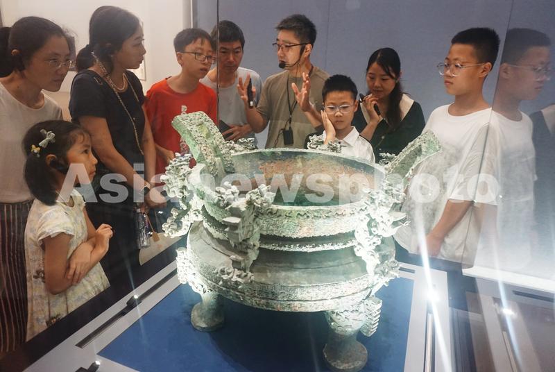 2023年7月20日,观众在中原夏商周礼乐文明展上观看春秋时期的王子午鼎。