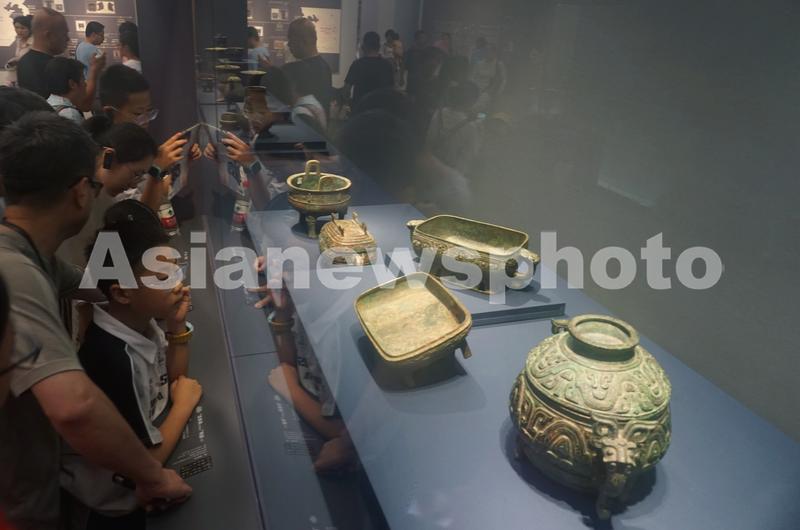 2023年7月20日,小观众和家长在中原夏商周礼乐文明展上观看多款具有铭文的西周青铜器。