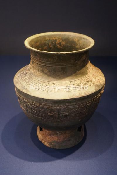 2023年7月20日,在中原夏商周礼乐文明展上拍摄到的商代前期的兽面纹罍。