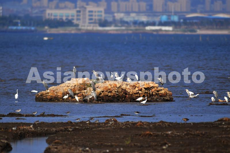 2023年7月19日,在山东省青岛市胶州湾国家级海洋公园红岛段,成群苍鹭和白鹭在海岸栖息。