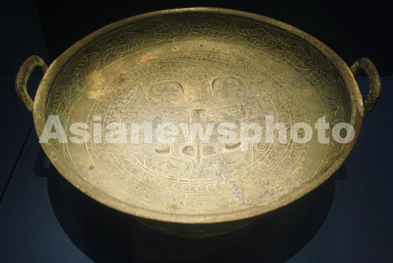 2023年7月20日,在中原夏商周礼乐文明展上拍摄到的春秋时期的蟠龙纹铜盘。