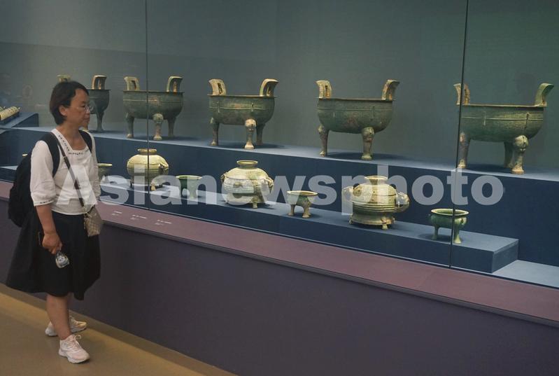 2023年7月20日,观众在中原夏商周礼乐文明展上观看春秋时期象征王权的蟠螭纹铜鼎和铜簋等器物。