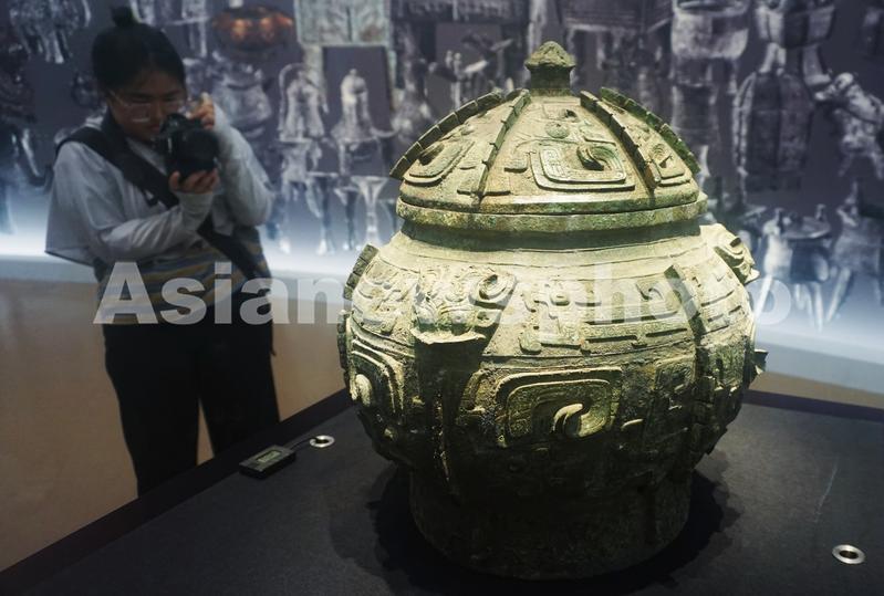 2023年7月20日,观众在中原夏商周礼乐文明展上观看安阳殷墟妇好墓出土的饕餮纹瓿。
