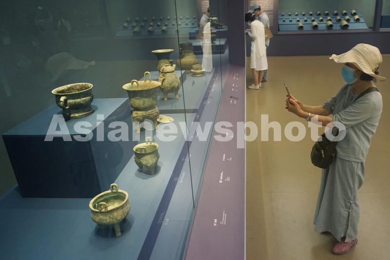 2023年7月20日, 观众在中原夏商周礼乐文明展上观看各类商代青铜器。