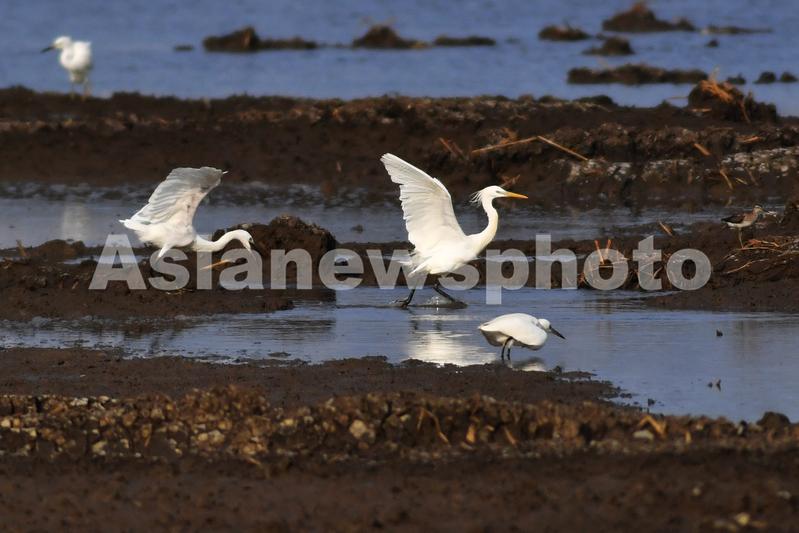 2023年7月19日,在山东省青岛市胶州湾国家级海洋公园红岛段,一只白鹭驱赶觅食的黄嘴白鹭。