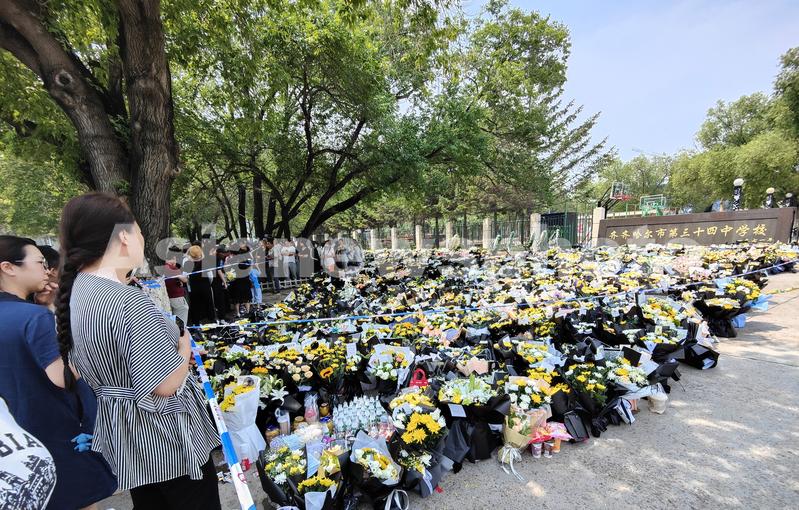 2023年7月25日上午,黑龙江齐齐哈尔第34中学校门口,献花祭奠的市民络绎不绝,校门口的空地上摆满了鲜花,悼念体育馆屋顶坍塌事故中的遇难者。
