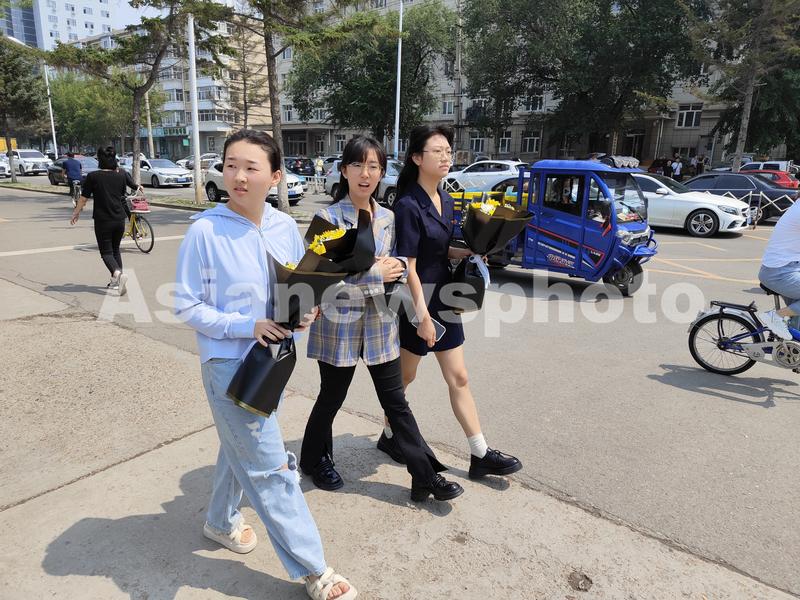 2023年7月25日上午,黑龙江齐齐哈尔第34中学校门口,献花祭奠的市民络绎不绝,校门口的空地上摆满了鲜花,悼念体育馆屋顶坍塌事故中的遇难者。