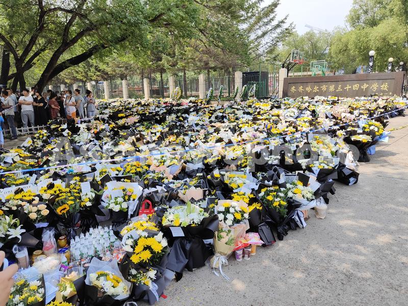 2023年7月25日上午,黑龙江齐齐哈尔第34中学校门口,献花祭奠的市民络绎不绝,校门口的空地上摆满了鲜花,悼念体育馆屋顶坍塌事故中的遇难者。