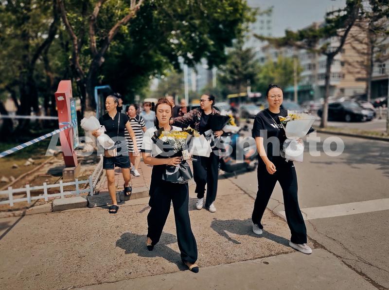 2023年7月25日上午,黑龙江齐齐哈尔第34中学校门口,献花祭奠的市民络绎不绝,校门口的空地上摆满了鲜花,悼念体育馆屋顶坍塌事故中的遇难者。