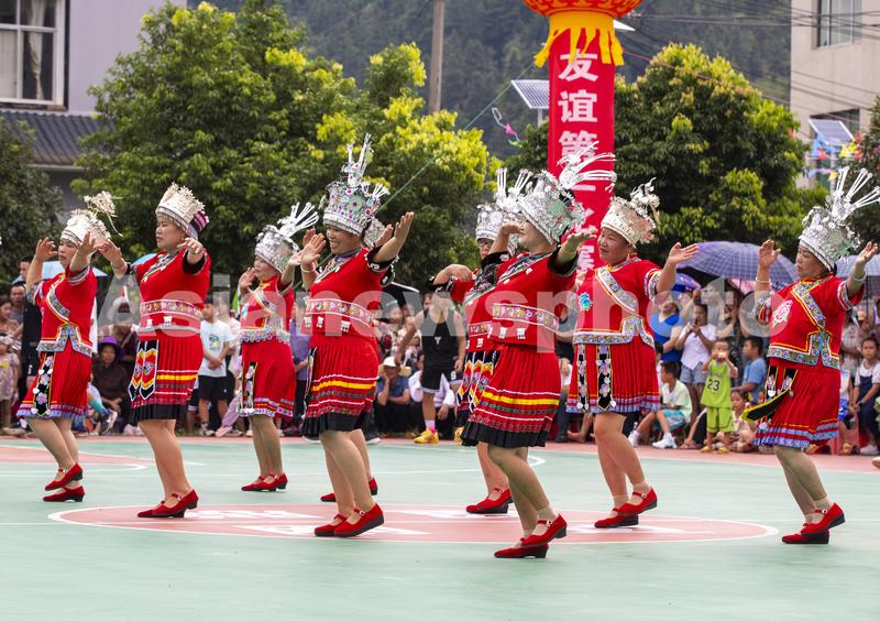 图片说明:2023年7月25日,村民在贵州省从江县刚边壮族乡良田村篮球比赛场上进行舞蹈表演。