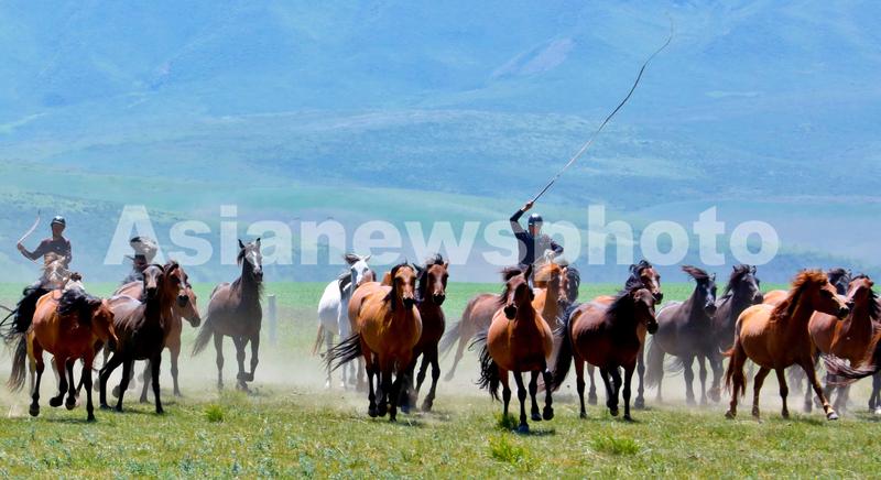 图片说明:2023年7月25日,位于祁连山北麓的甘肃省张掖市山丹马场草原绿草如茵,牧马人放牧途中,奔跑的马群现“骏马奔腾嘶鸣欢”美景,吸引了众多游客驻足观赏。