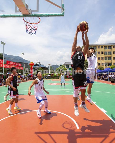 图片说明:2023年7月25日,村民在贵州省从江县刚边壮族乡良田村参加篮球比赛。
