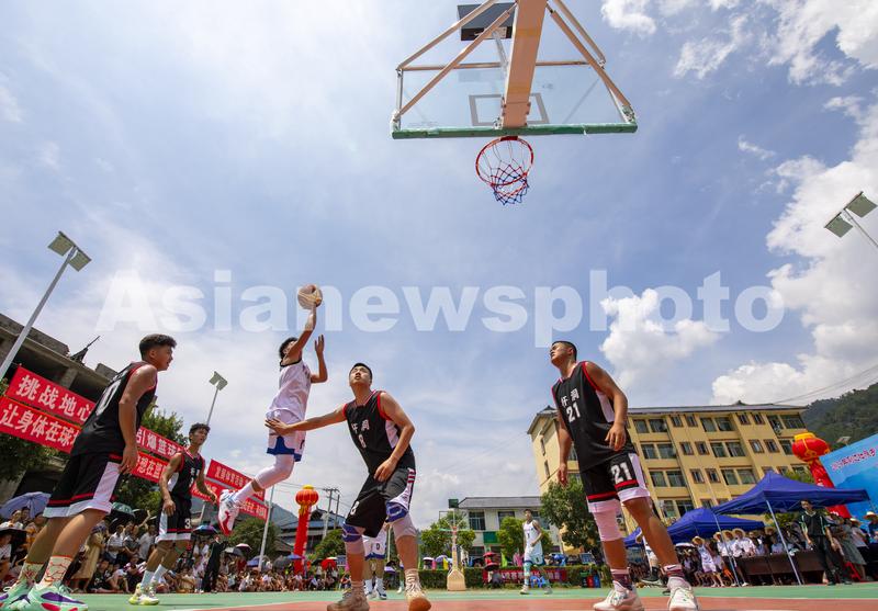 图片说明:2023年7月25日,村民在贵州省从江县刚边壮族乡良田村参加篮球比赛。