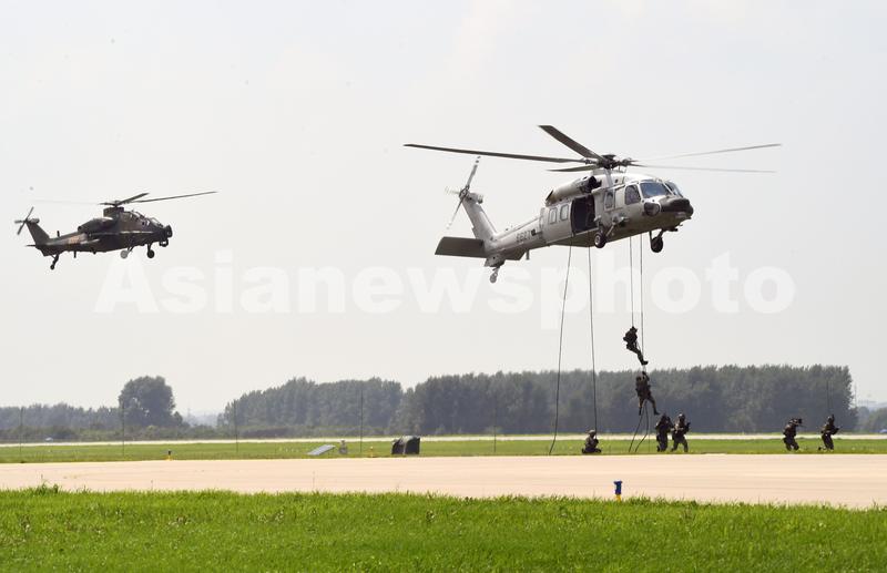 直-20和直-10进行空降突击等课目演练,索降突击队员