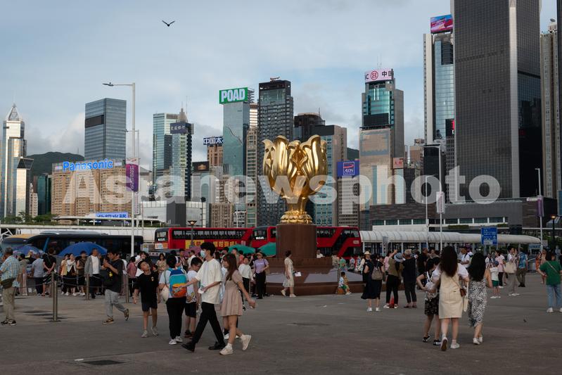 图片说明:2023年7月23日,香港金紫荆广场上游客众多,来自各地的游客纷纷在此停留拍照打卡。