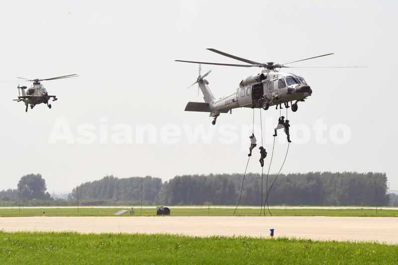 直-20和直-10进行空降突击等课目演练,索降突击队员