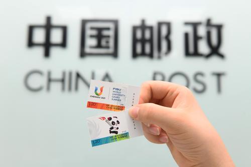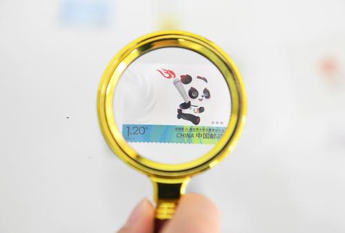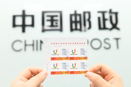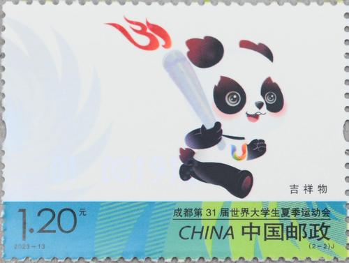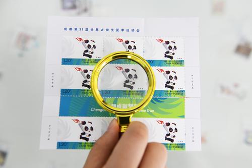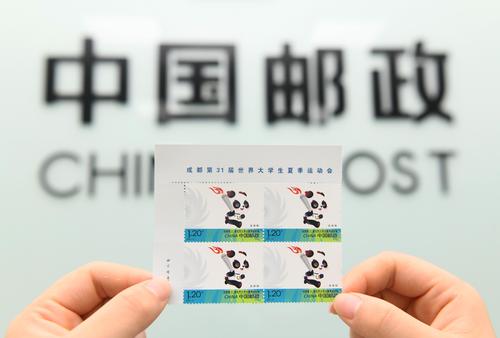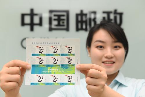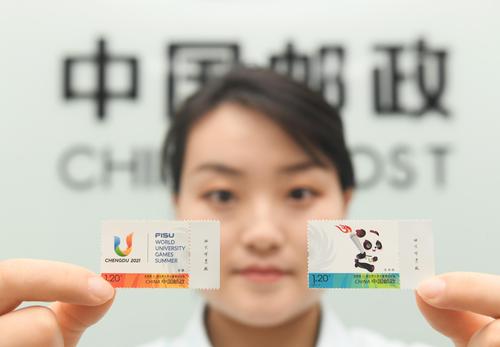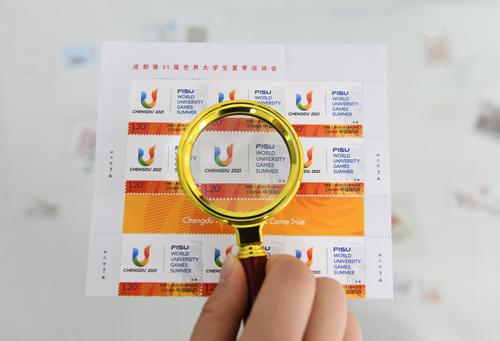 2023年7月28日,中国邮政集团公司河北省新乐市分公司工作人员展示发行的《成都第31届世界大学生夏季运动会》纪念邮票。当日,中国邮政发行《成都第31届世界大学生夏季运动会》纪念邮票一套2枚,邮票图案名称分别为会徽、吉祥物。全套邮票面值2.40元。