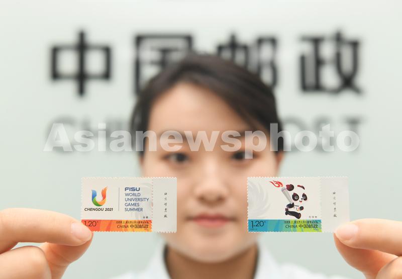 2023年7月28日,中国邮政集团公司河北省新乐市分公司工作人员展示发行的《成都第31届世界大学生夏季运动会》纪念邮票。当日,中国邮政发行《成都第31届世界大学生夏季运动会》纪念邮票一套2枚,邮票图案名称分别为会徽、吉祥物。全套邮票面值2.40元。