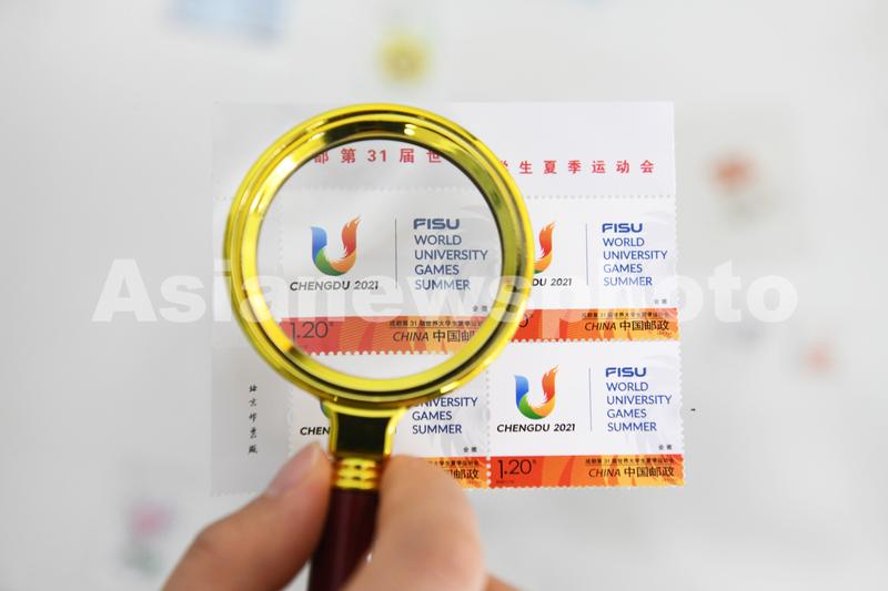 2023年7月28日,中国邮政集团公司河北省新乐市分公司工作人员展示发行的《成都第31届世界大学生夏季运动会》纪念邮票。当日,中国邮政发行《成都第31届世界大学生夏季运动会》纪念邮票一套2枚,邮票图案名称分别为会徽、吉祥物。全套邮票面值2.40元。