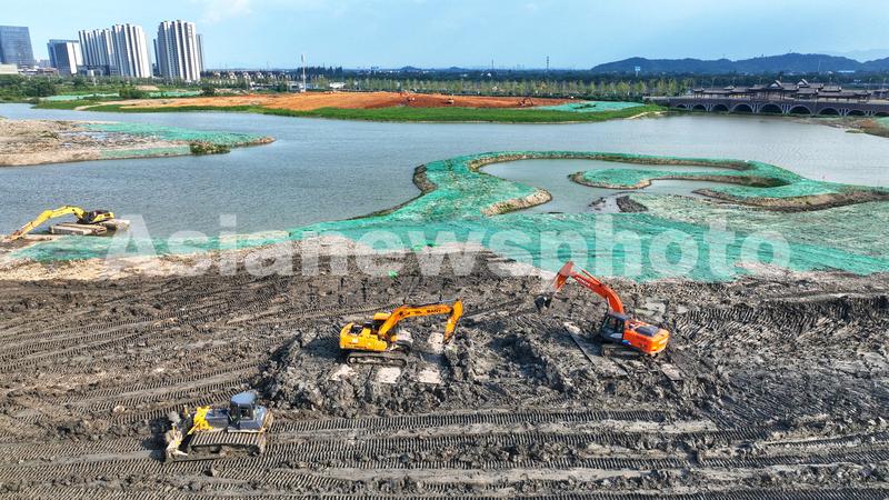 2023年7月31日,在浙江省湖州市德清县康乾街道金鹅湖湿地公园施工现场,挖掘机在进行土方开挖工程作业。该湿地公园原本是一个荒草丛生的水洼地,通过开展水系连通、河道清淤、驳岸处理、生态修复等工程。这里建成后将成为集生态净化、观光游赏、康体休闲和自然教育功能为一体的综合性湿地公园。