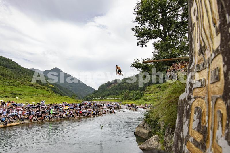 2023年7月31日,在贵州省从江县刚边壮族乡刚边村,壮族同胞在进行跳水选亲。