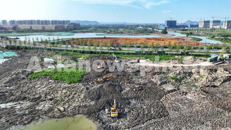 2023年7月31日,在浙江省湖州市德清县康乾街道金鹅湖湿地公园施工现场,挖掘机在进行土方开挖工程作业。