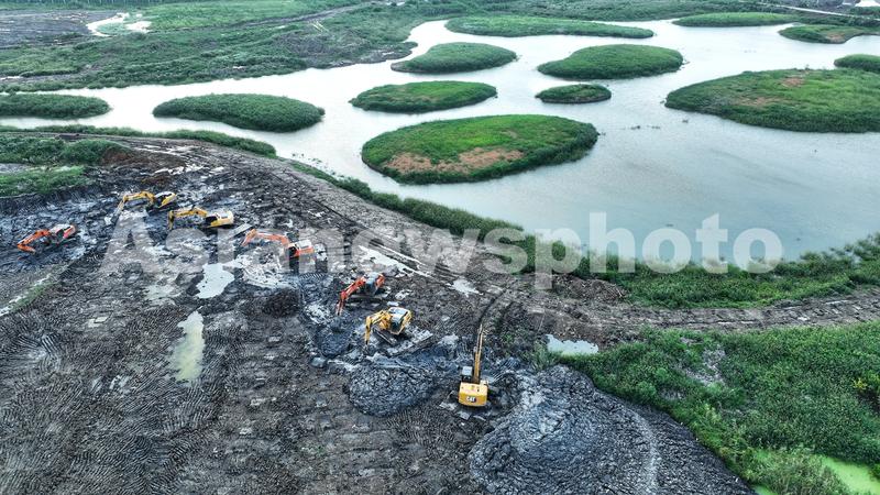 2023年7月31日,在浙江省湖州市德清县康乾街道金鹅湖湿地公园施工现场,挖掘机在进行土方开挖工程作业。该湿地公园原本是一个荒草丛生的水洼地,通过开展水系连通、河道清淤、驳岸处理、生态修复等工程。这里建成后将成为集生态净化、观光游赏、康体休闲和自然教育功能为一体的综合性湿地公园。