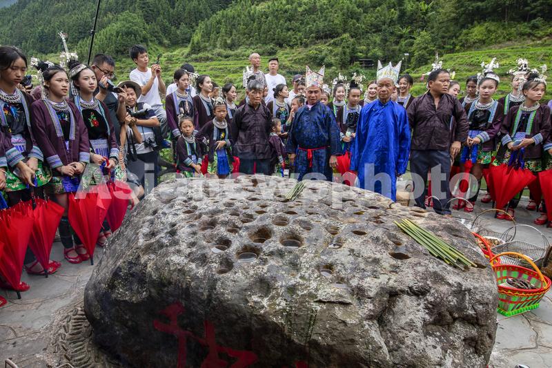 2023年7月31日,在贵州省从江县刚边壮族乡刚边村,壮族同胞在举行“煨酒石”祭祀活动。