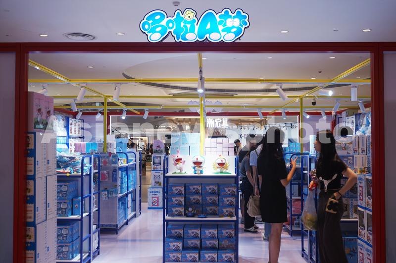 2023年8月1日,顾客在杭州一家商场内的“哆啦A梦”快闪店内选购各类与机器猫相关的文创产品。