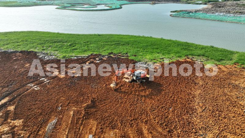 2023年7月31日,在浙江省湖州市德清县康乾街道金鹅湖湿地公园施工现场,挖掘机在进行土方开挖工程作业。