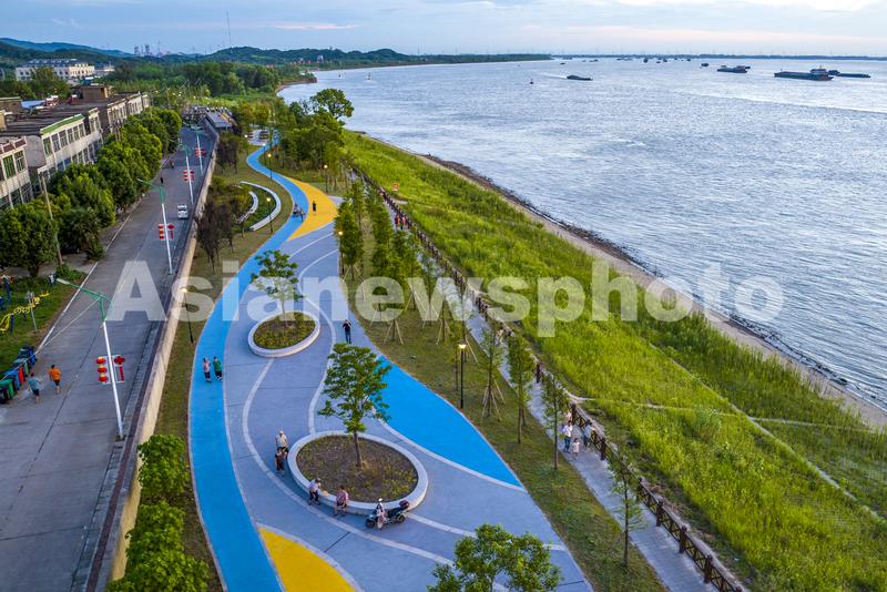 2023年8月1日傍晚,安徽省芜湖市繁昌区新港镇居民在滨江公园休闲散步,欣赏江景(无人机照片)。