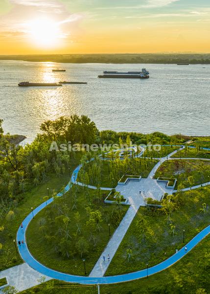 2023年8月1日傍晚,安徽省芜湖市繁昌区新港镇居民在滨江公园休闲散步,欣赏江景(无人机照片)。