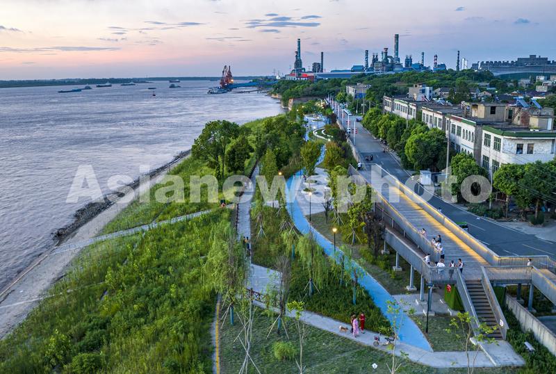 2023年8月1日傍晚,安徽省芜湖市繁昌区新港镇居民在滨江公园休闲散步,欣赏江景(无人机照片)。
