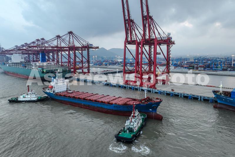 图片说明:2023年8月10日清晨,科摩罗籍“索菲娅”集装箱轮缓缓驶入宁波舟山港,在二艘拖轮的协助下靠泊金塘港区大浦口集装箱码头。