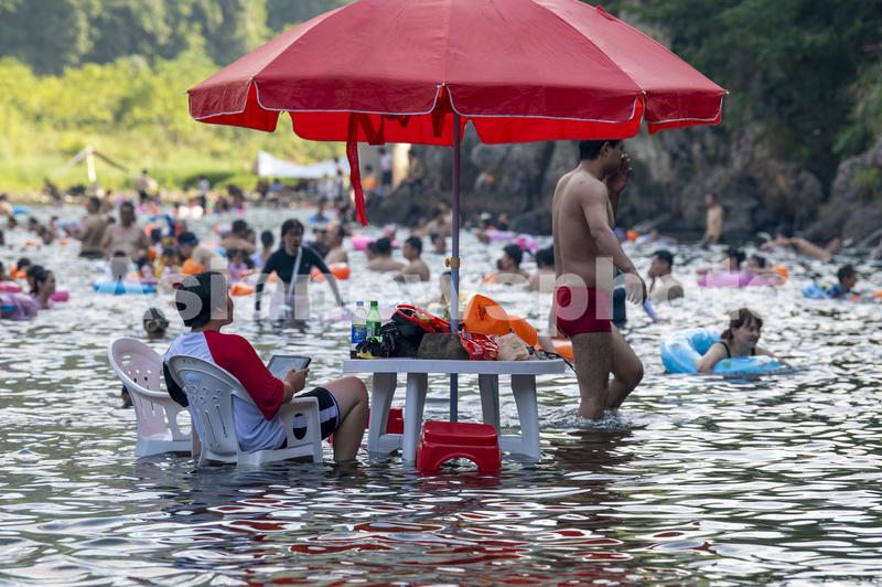 图片说明:2023年8月13日,浙江省丽水市莲都区黄村乡严溪之畔的露营基地,来自周边各地游客在清澈的溪水里消暑。
