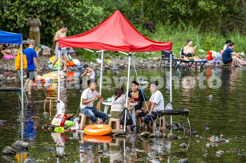 图片说明:2023年8月13日,浙江省丽水市莲都区黄村乡严溪之畔的露营基地,来自周边各地游客在清澈的溪水里消暑。