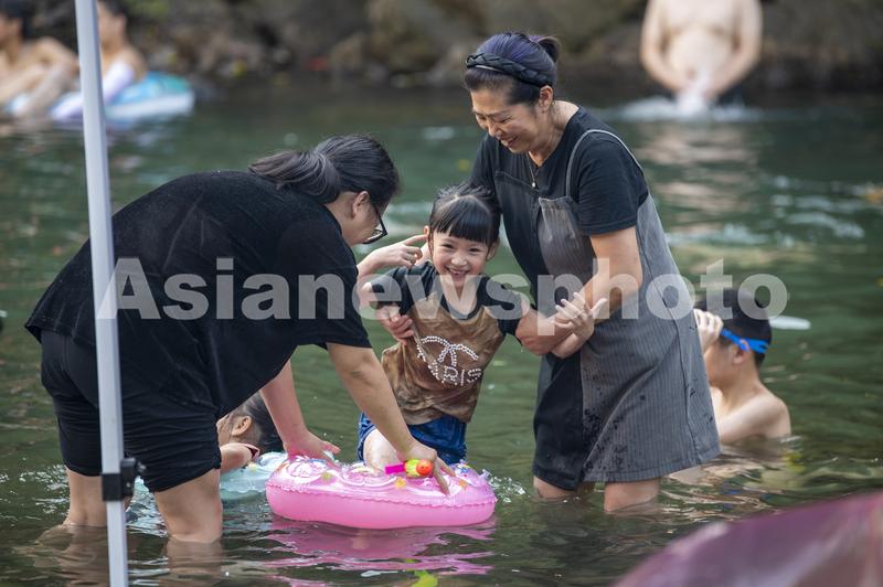 图片说明:2023年8月13日,浙江省丽水市莲都区黄村乡严溪之畔的露营基地,来自周边各地游客在清澈的溪水里消暑。