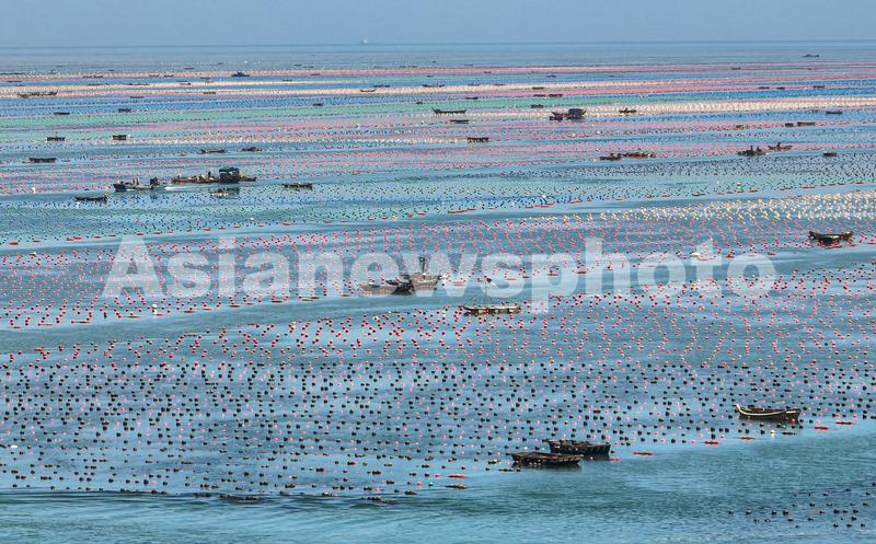 2023年8月15日,在山东省荣成市各大海洋牧场生态养殖区,渔民们驾驶渔船、舢板穿梭在彩色生态养殖浮漂间,进行渔业养殖管护、贝类播种等海上作业。
