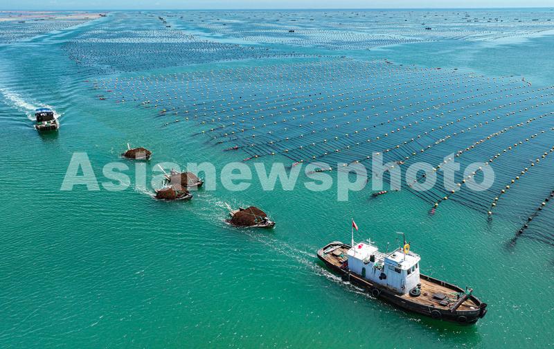 2023年8月15日,在山东省荣成市各大海洋牧场生态养殖区,渔民们驾驶渔船、舢板穿梭在彩色生态养殖浮漂间,进行渔业养殖管护、贝类播种等海上作业。