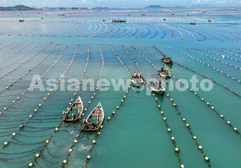 2023年8月15日,在山东省荣成市各大海洋牧场生态养殖区,渔民们驾驶渔船、舢板穿梭在彩色生态养殖浮漂间,进行渔业养殖管护、贝类播种等海上作业。