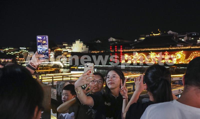 图片说明:2023年8月14日,江苏省南京市,游客在秦淮河畔夫子庙景区自拍。