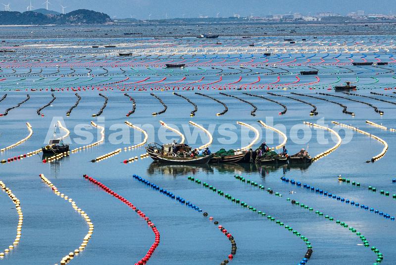 2023年8月15日,在山东省荣成市各大海洋牧场生态养殖区,渔民们驾驶渔船、舢板穿梭在彩色生态养殖浮漂间,进行渔业养殖管护、贝类播种等海上作业。