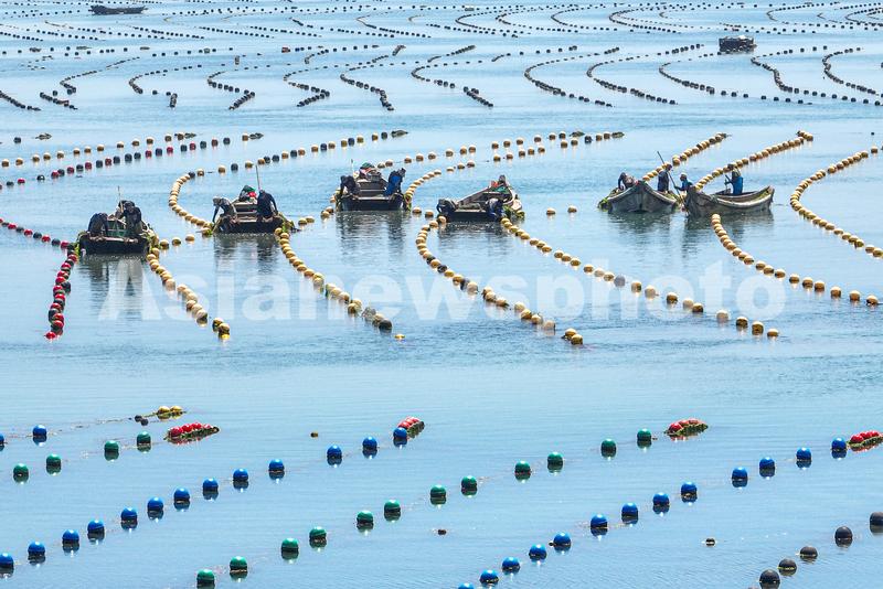 2023年8月15日,在山东省荣成市各大海洋牧场生态养殖区,渔民们驾驶渔船、舢板穿梭在彩色生态养殖浮漂间,进行渔业养殖管护、贝类播种等海上作业。